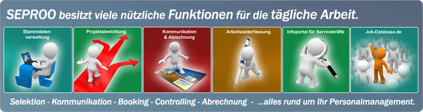 Mit SEPROO planen Sie auch größere Projekte mit einer Vielzahl an Personal ohne Mühe. SEPROO übernimmt die Kontaktierung des Personals, die Buchungsabwicklung, die Arbeitszeiterfassung, die Honorarabrechnung und vieles mehr.